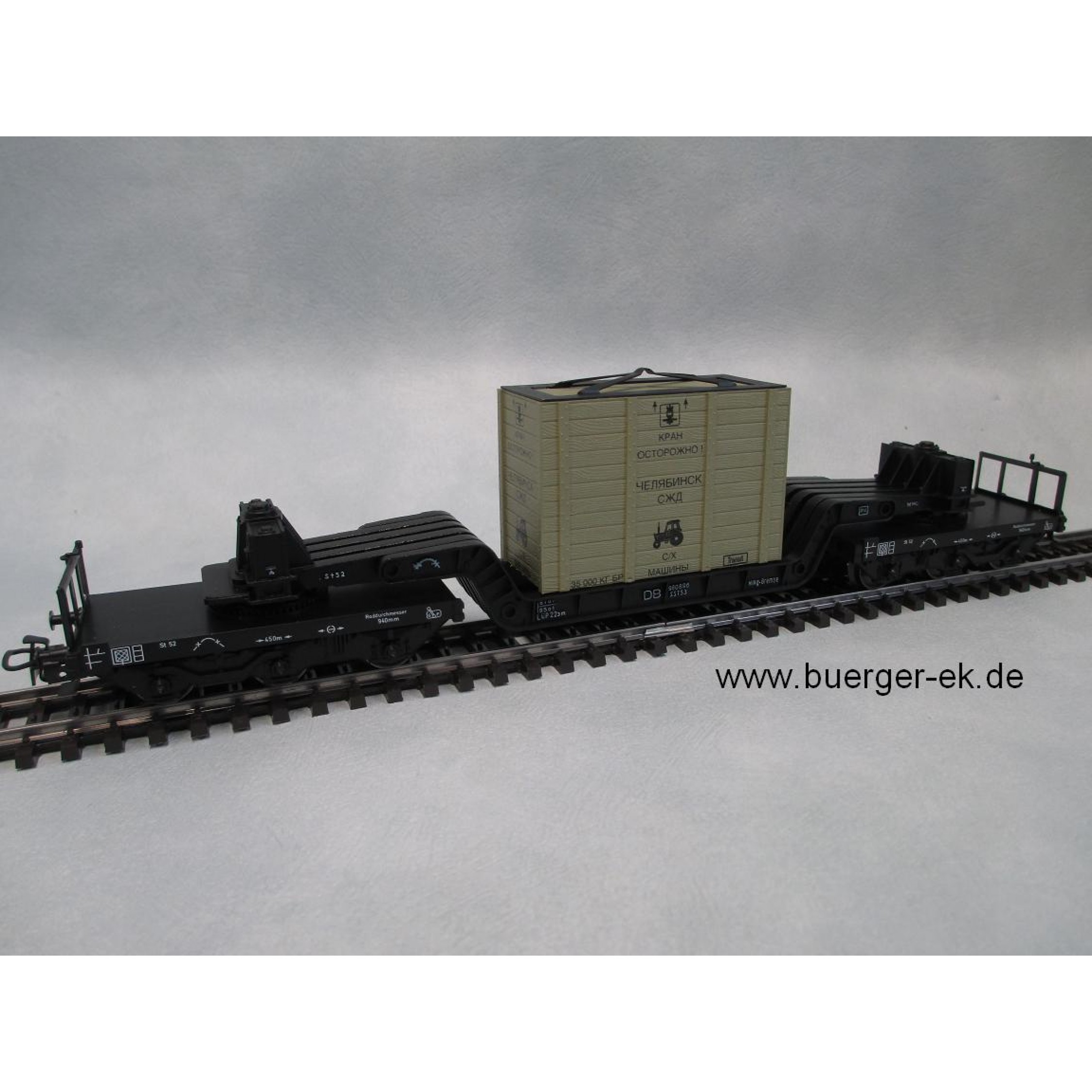 Tiefladewagen der DB, beladen mit Kiste, 6achsig
