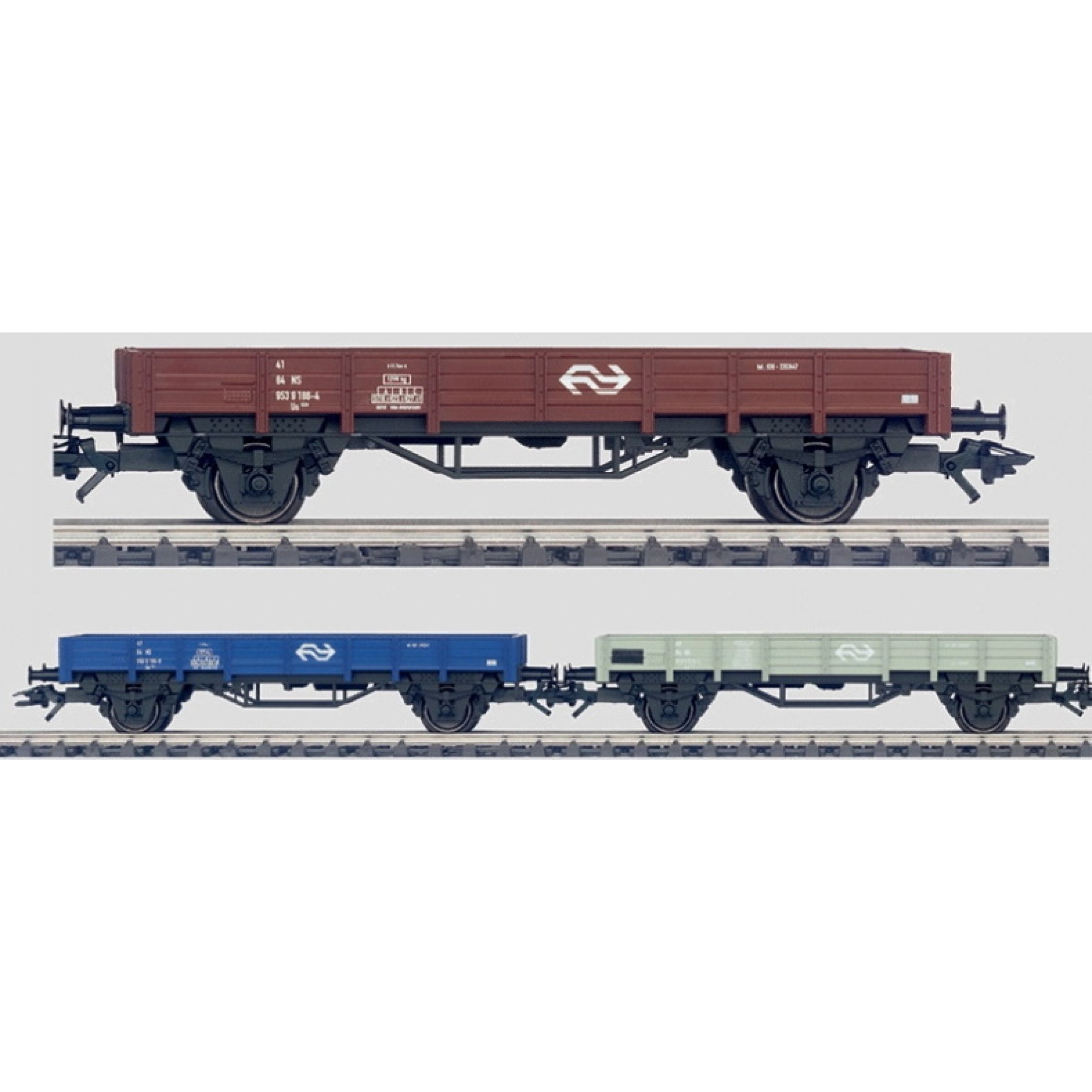 Wagenset 3 Niederbordwagen Typ E 515 der Niederländischen Staatsbahnen - NS, 1 Wagen blau, 1 Wagen grau, 1 Wagen braun