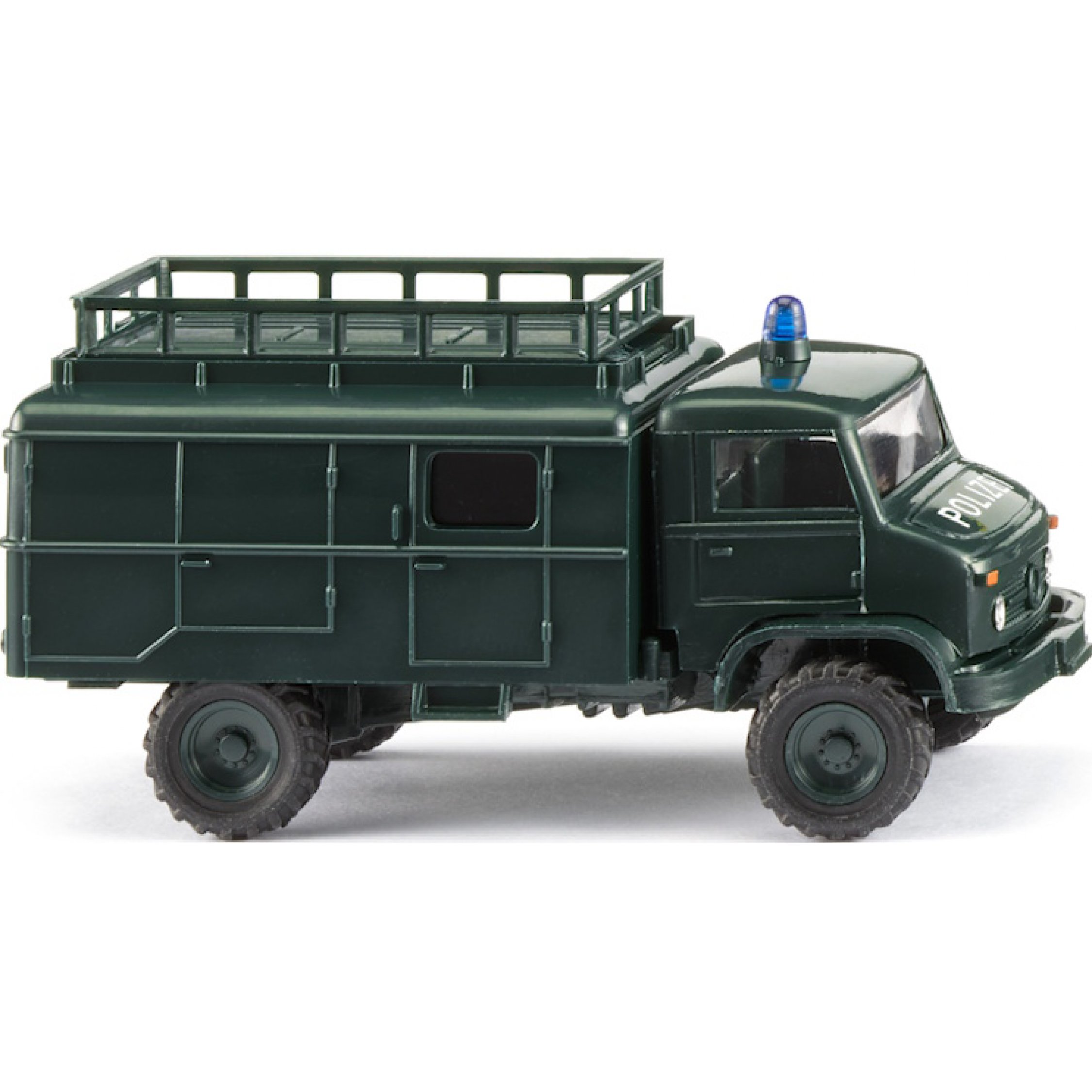 Mercedes-Benz Unimog S 404 mit Kofferaufbau und Dachträger, Bereitschaftspolizei, tannengrün, Baujahr 1955-1980