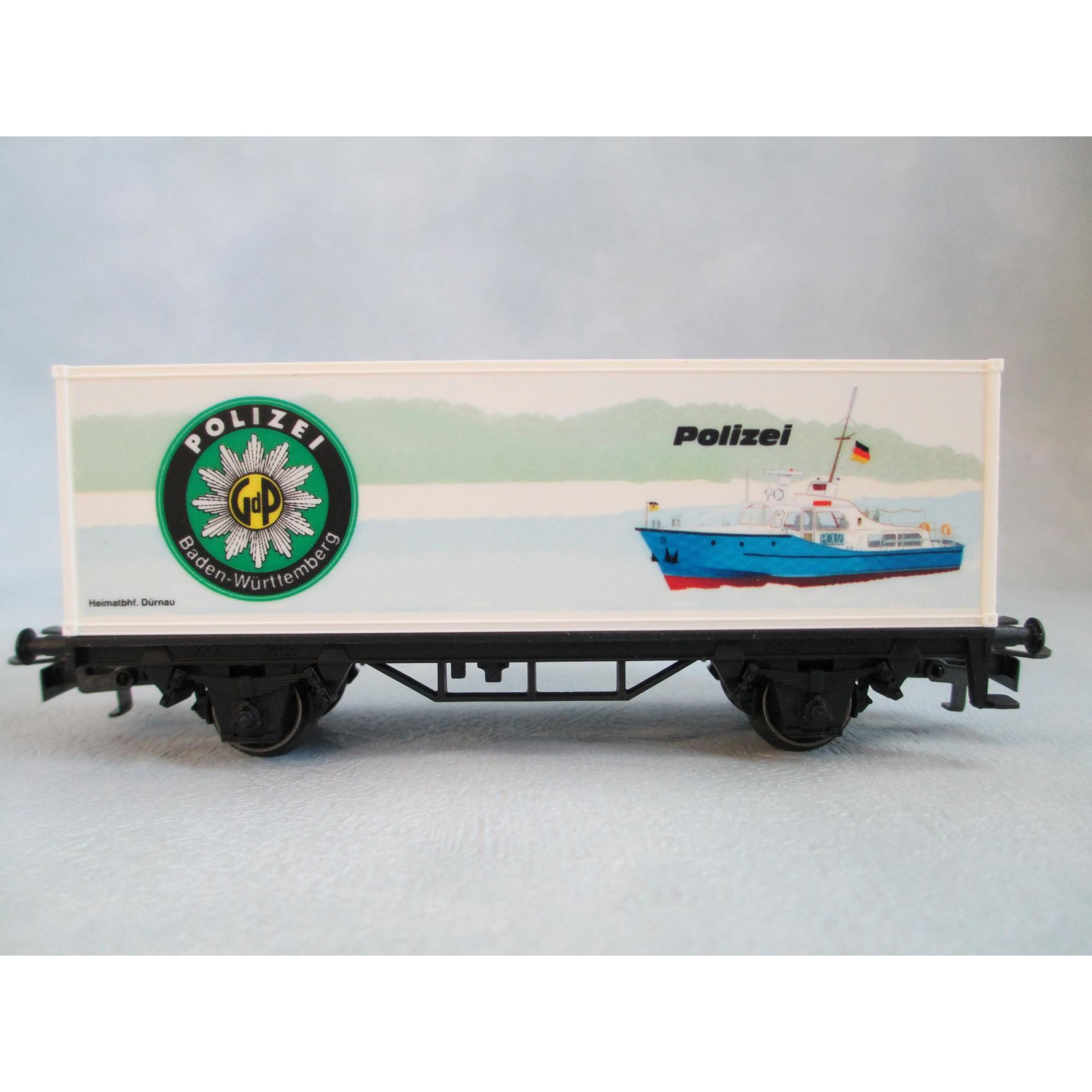 4. POLIZEI Baden-Württemberg (bunte Abbildung eines Schiffes der Wasserschutzpolizei), (Containerwagen mit glatten Seitenwänden)