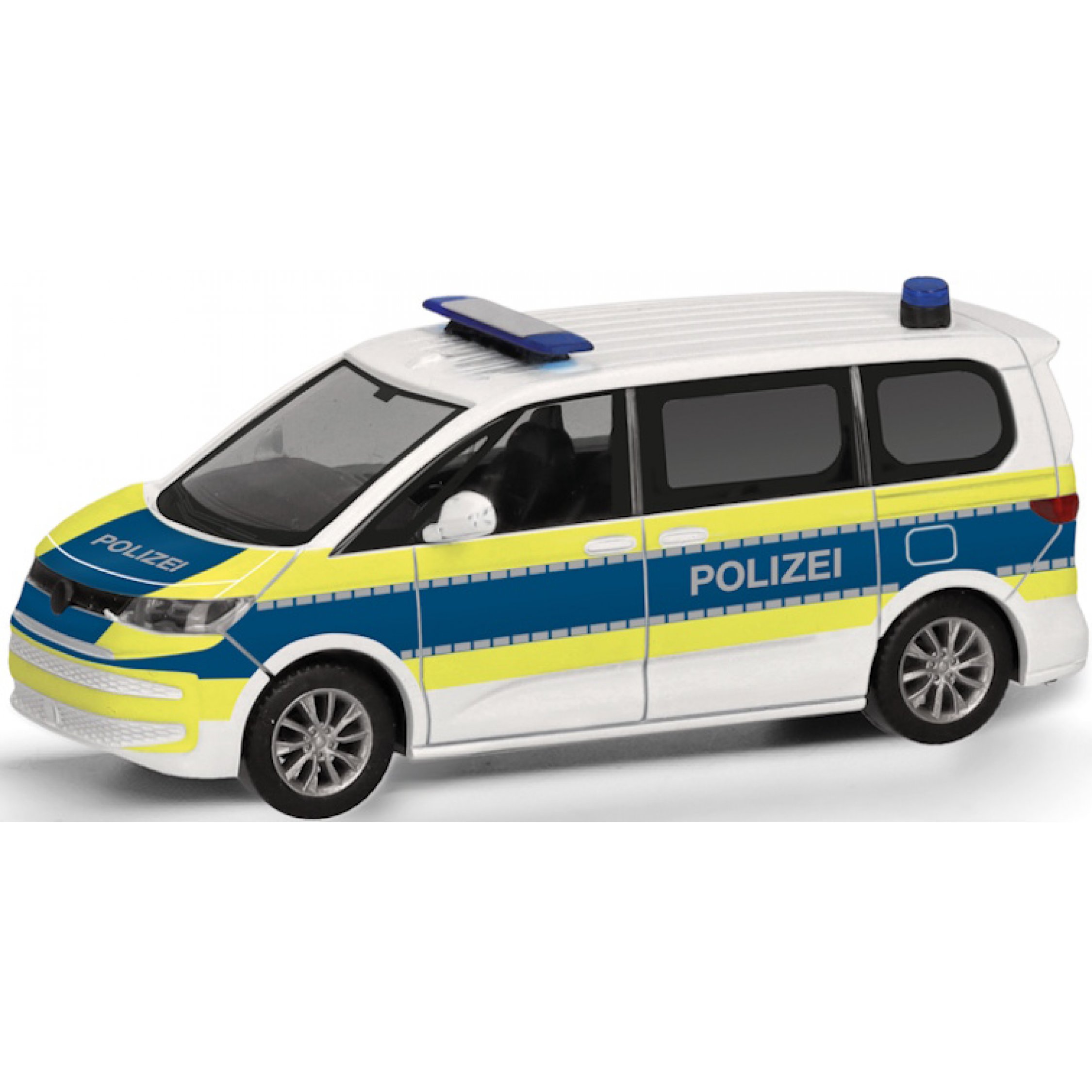 VW Multivan, Polizei Niedersachsen, weiß/blau mit leuchtgelbem Streifendesign