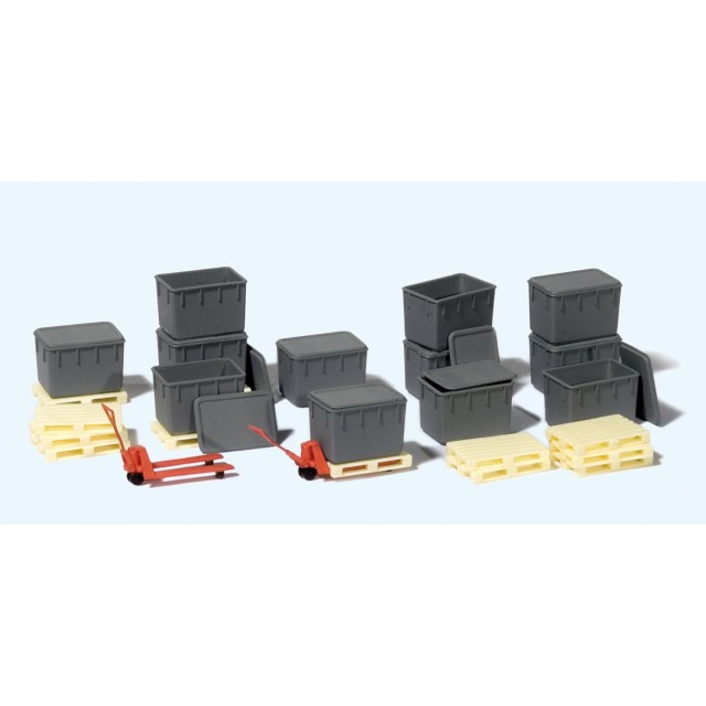4. 12 Kunststoffbehälter, stapelbar, Deckel lose. 12 Paletten, 2 Hubwagen, Bausatz