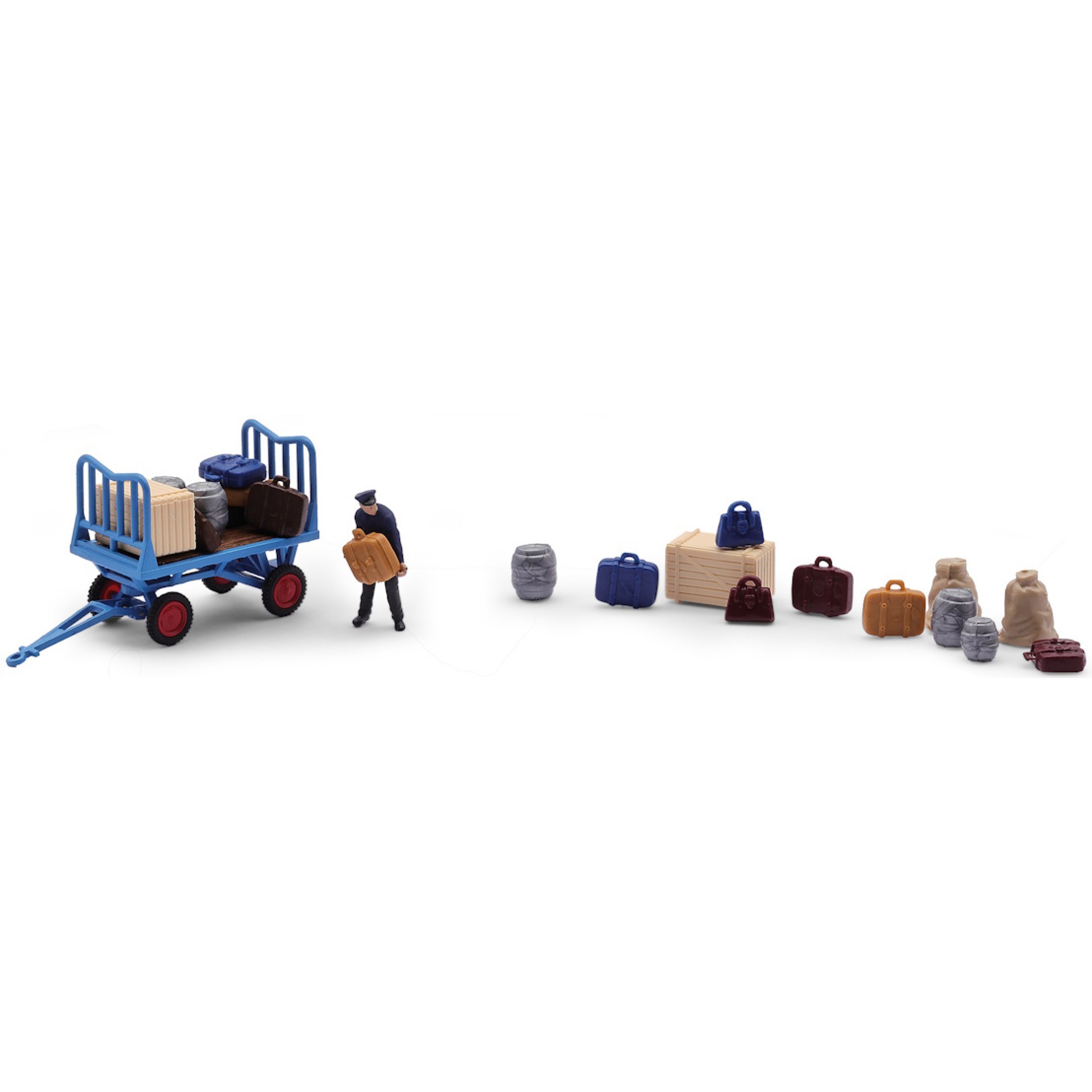 Bahnsteigkarre beladen, Bahnmitarbeiter belädt eine Bahnsteigkarre mit Koffern, Taschen und Fässern
