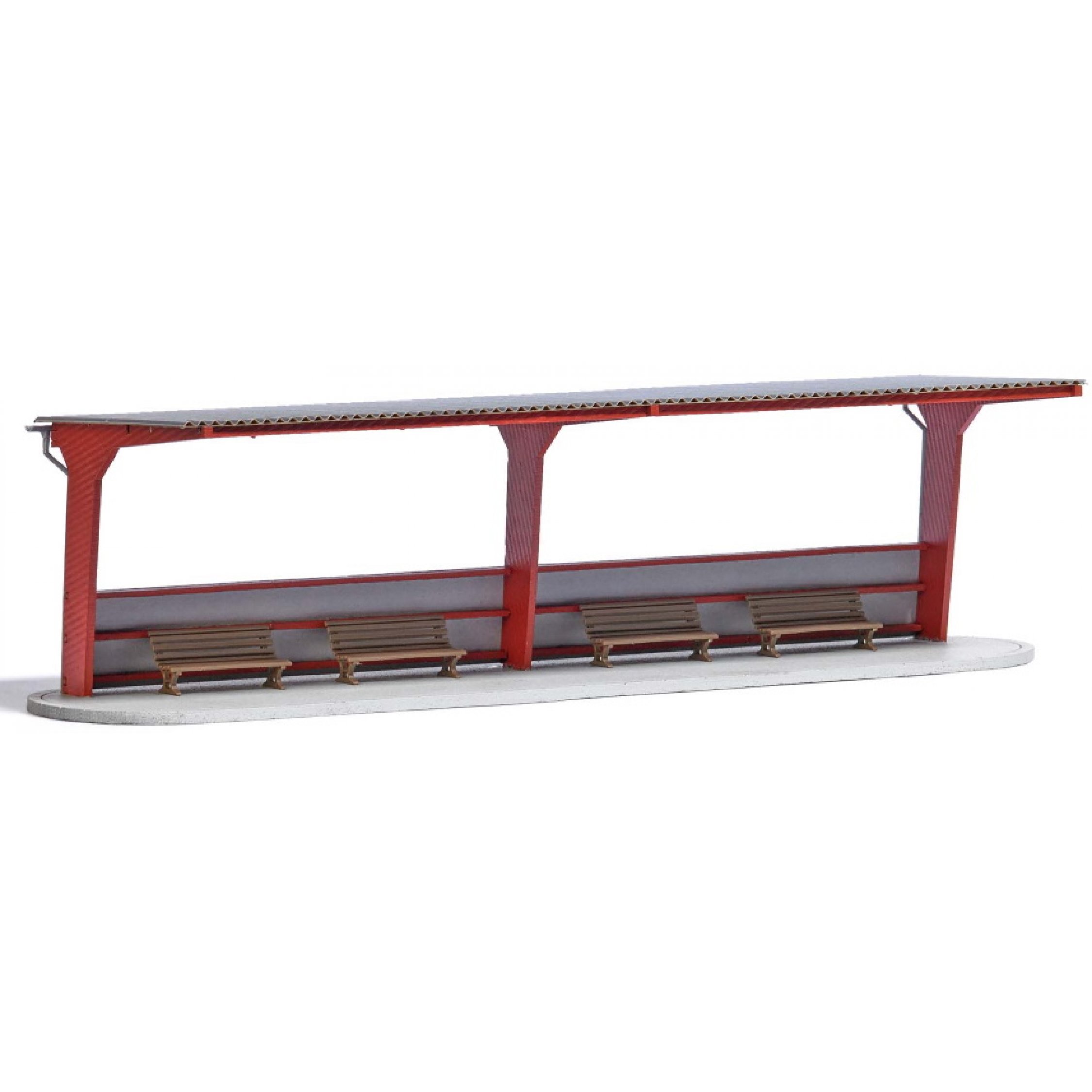 Busbahnhof, Bausatz für einen universell einsetzbaren Busbahnhof mit Wellblechüberdachung und 4 Sitzbänken. Größe: 190 x 54 x 53 mm