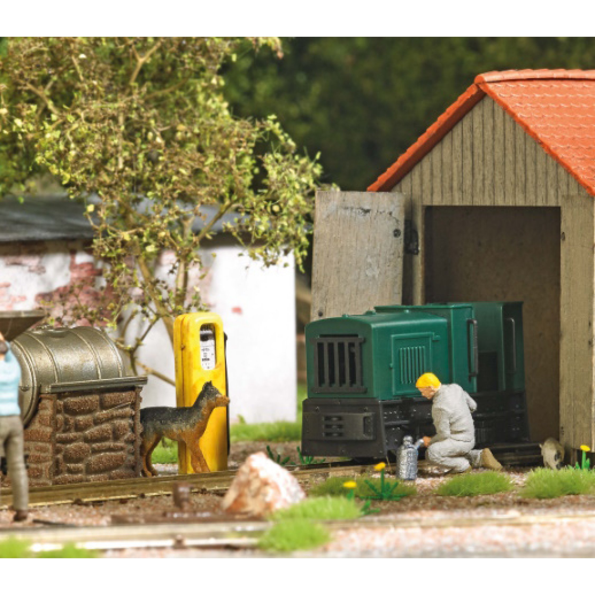 Diesellok ölen - Fahrer, der seine Felbahnlok ölt. Gmeinder 15/18 mit geschlossenem Dach und Ölkanne, Standmodell ohne Antrieb, Länge 36 mm