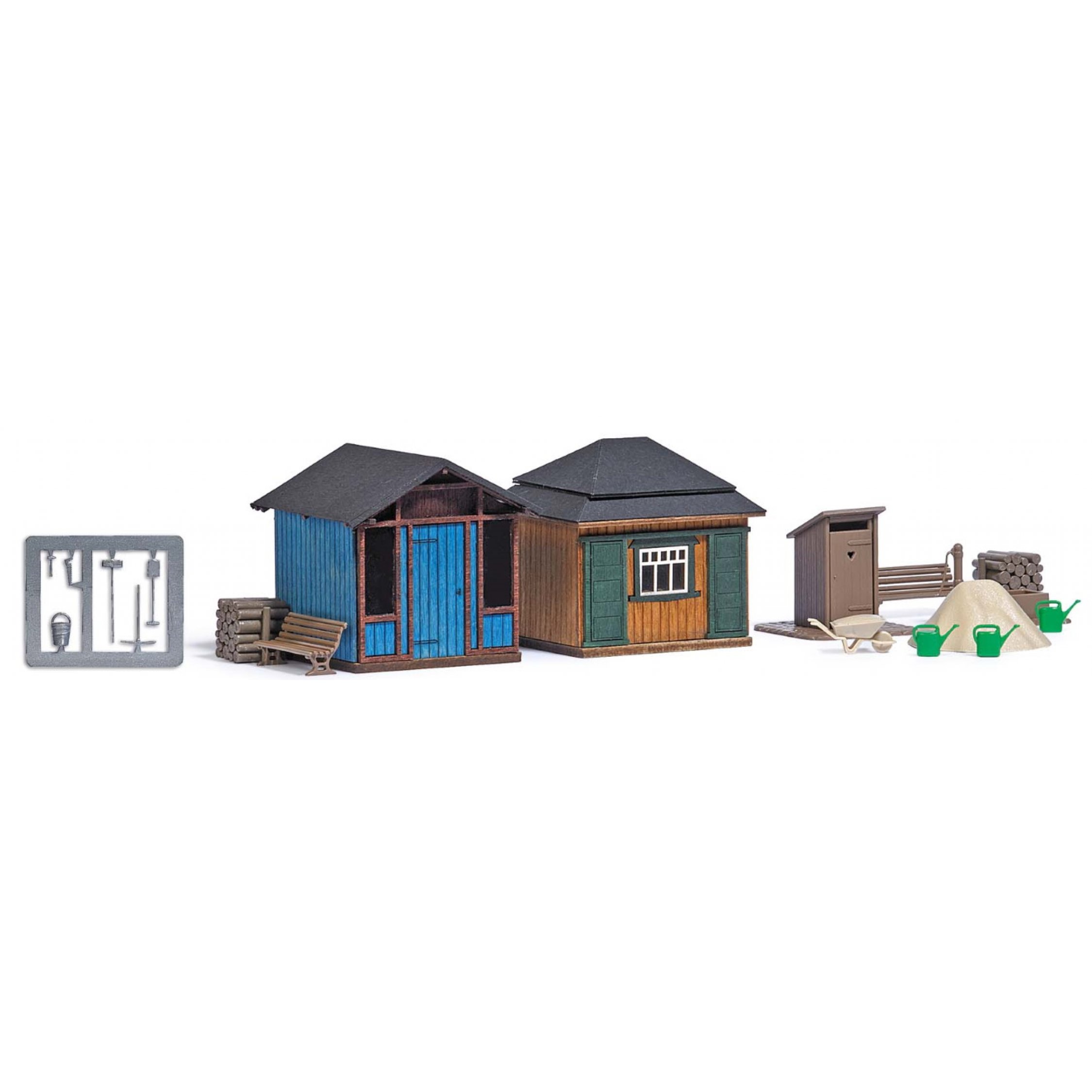 Gartenlauben Set 2, Bausatz mit 2 Gartenlauben in echter Holzbauweise, koloriert, mit Gartenzubehör, Sitzbänke, Holzstapel, Sandhaufen mit Schubkarren Gartenbrunnen, Toilettenhäuschen, Werkzeug und Gießkannen, Zaun 6,5 cm lang, Gartenlaube mit Walmdach 4,3x3,9x4,1 cm, Gartenlaube mit Giebeldach 4,2x4,1x4,1 cm
