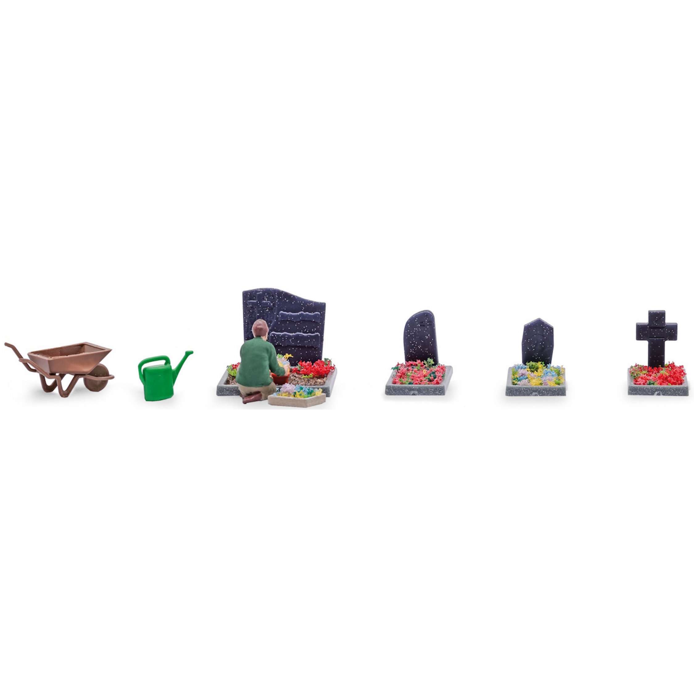 Grabpflege, 4 Gräber, Action-Set mit knieender Figur, 4 Grabeinfassungen, Gießkanne, Schubkarre, Handrechen