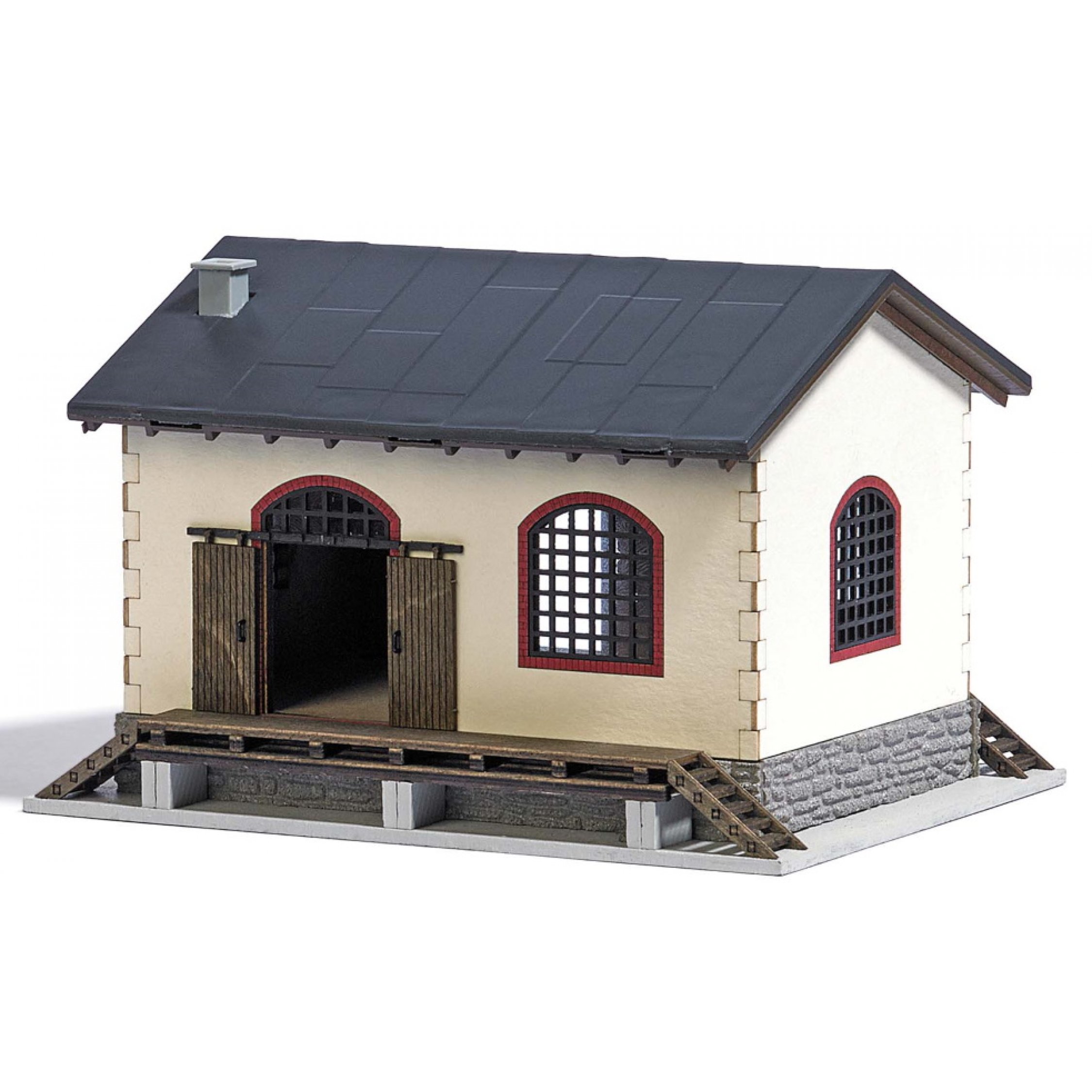 Kleiner Güterschuppen. Bausatz für einen Güterschuppen mit Laderampen und Schiebetoren an den Längsseiten. Alle Teile feritg koloriert. Größe: 144 x 88 x 74 mm.