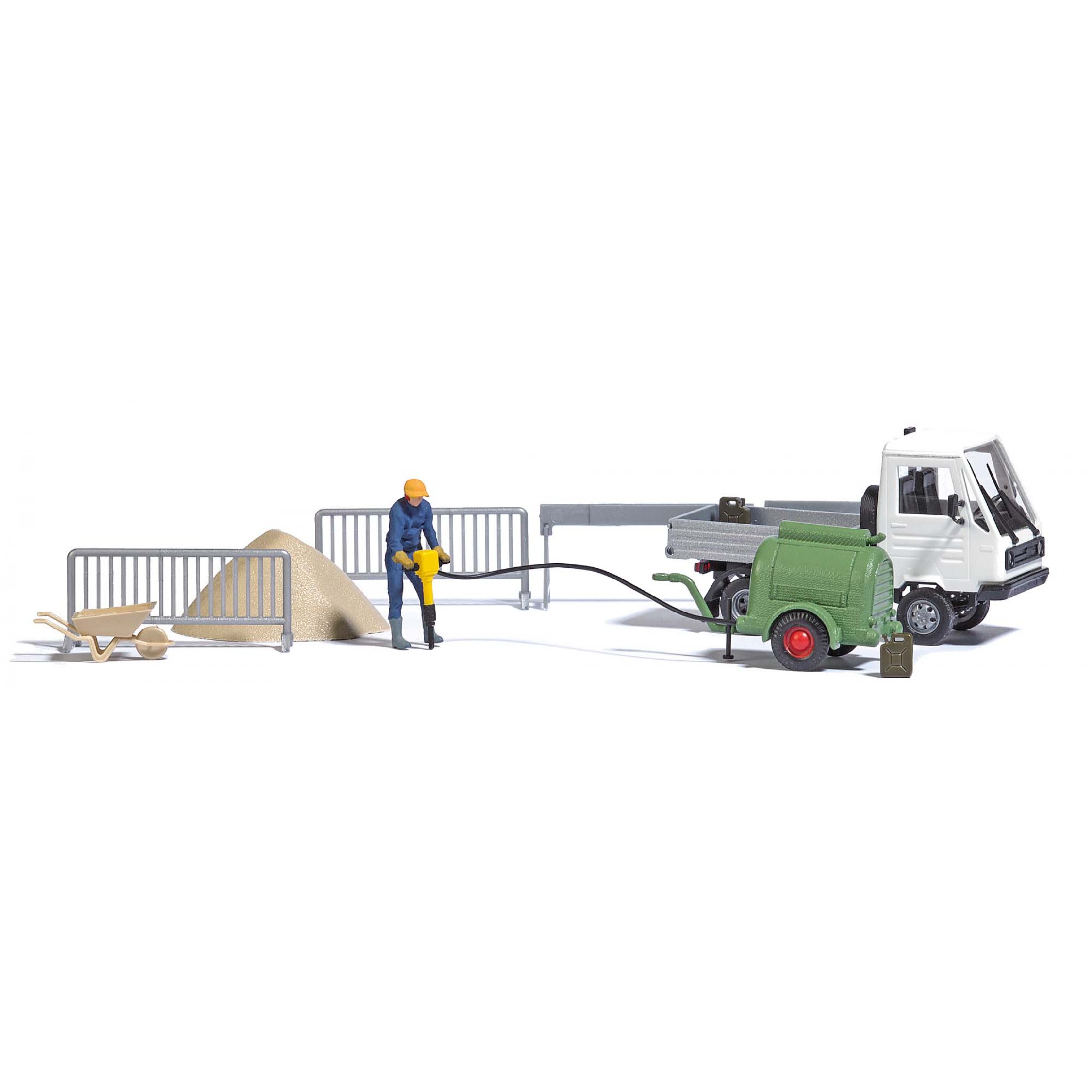 4. Kompressor mit Presslufthammer. Bauarbeiter mit Presslufthammer, Multicar Pritschenfahrzeug, Kanistern, Absperrungen, Sandhaufen und Schubkarren.
