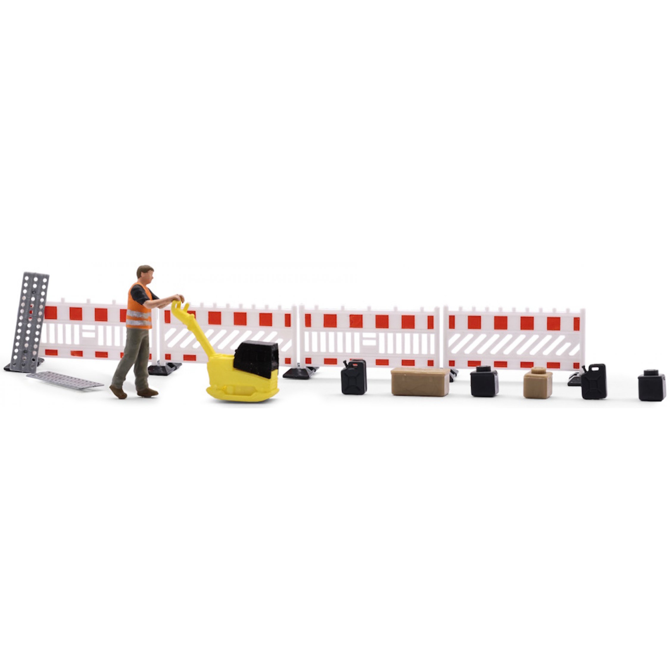 4. Profi an der Rüttelplatte, ein Bauarbeiter mit Rüttelplatte, moderner Schrankenzaun, Lochbleche, Kisten, Kanister, Action-Set