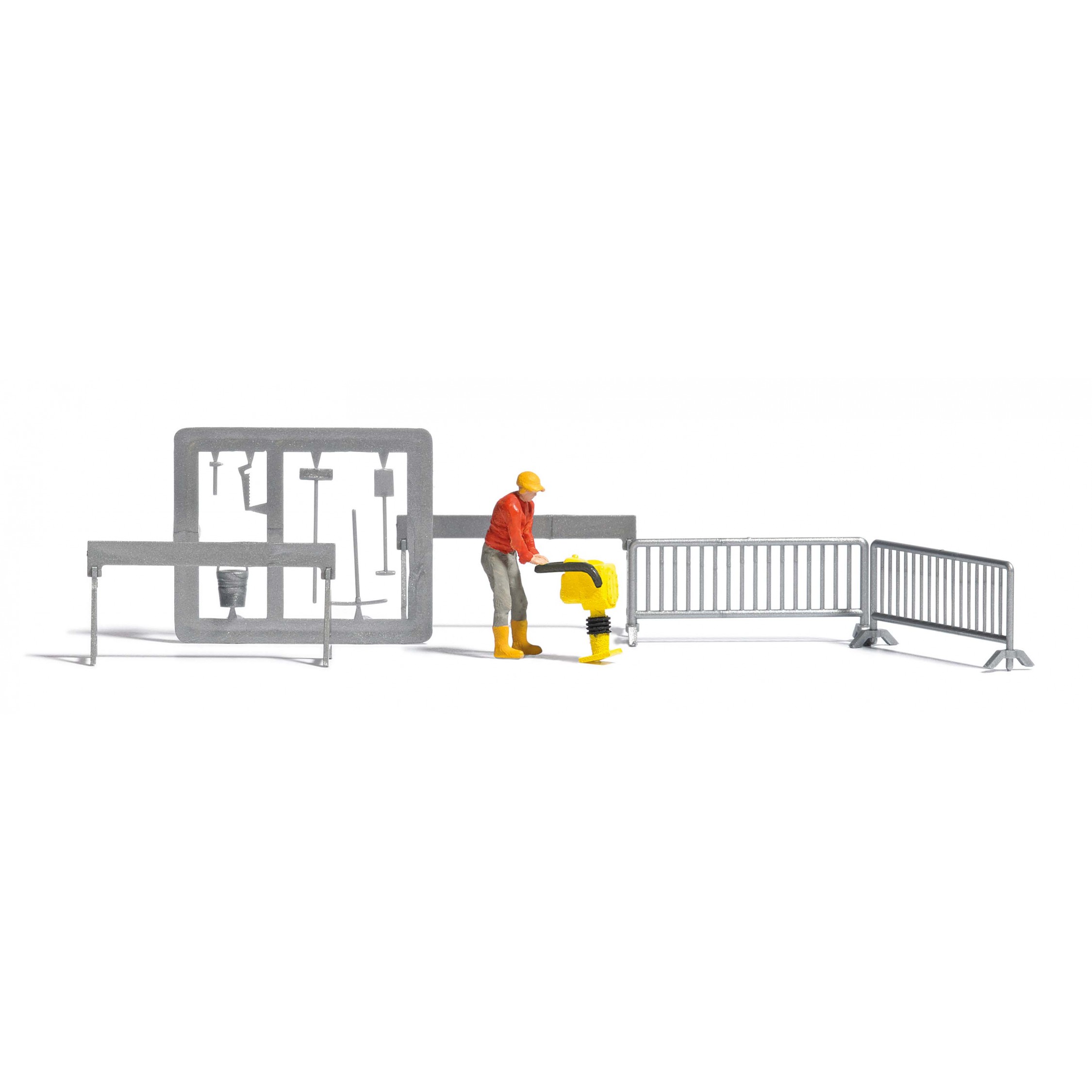 4. Rüttelstampfer mit Bauarbeiter, Absperrgitter, Spitzhacke, Schaufel, Besen, Werkzeug und Eimer