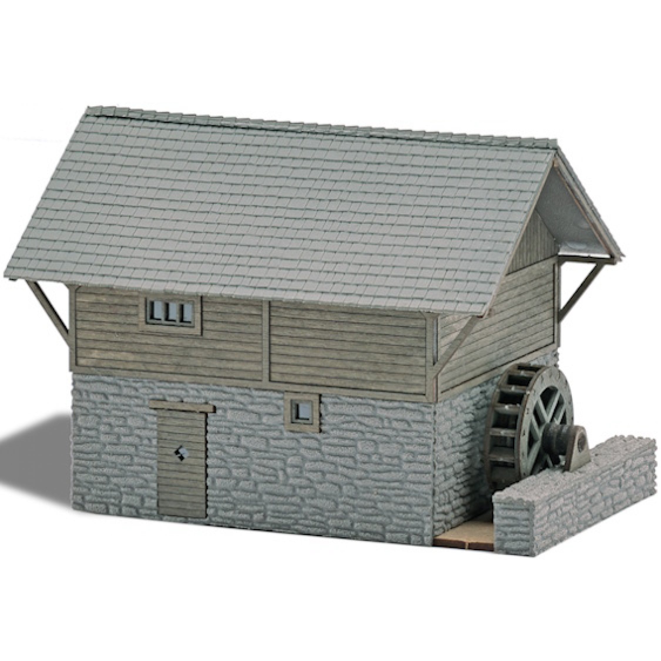 Wassermühle mit Mühlrad, Gebäudefassade in Steinoptik und aus echtem Holz, Bausatz, Größe 123 x 80 mm, Höhe 84 mm