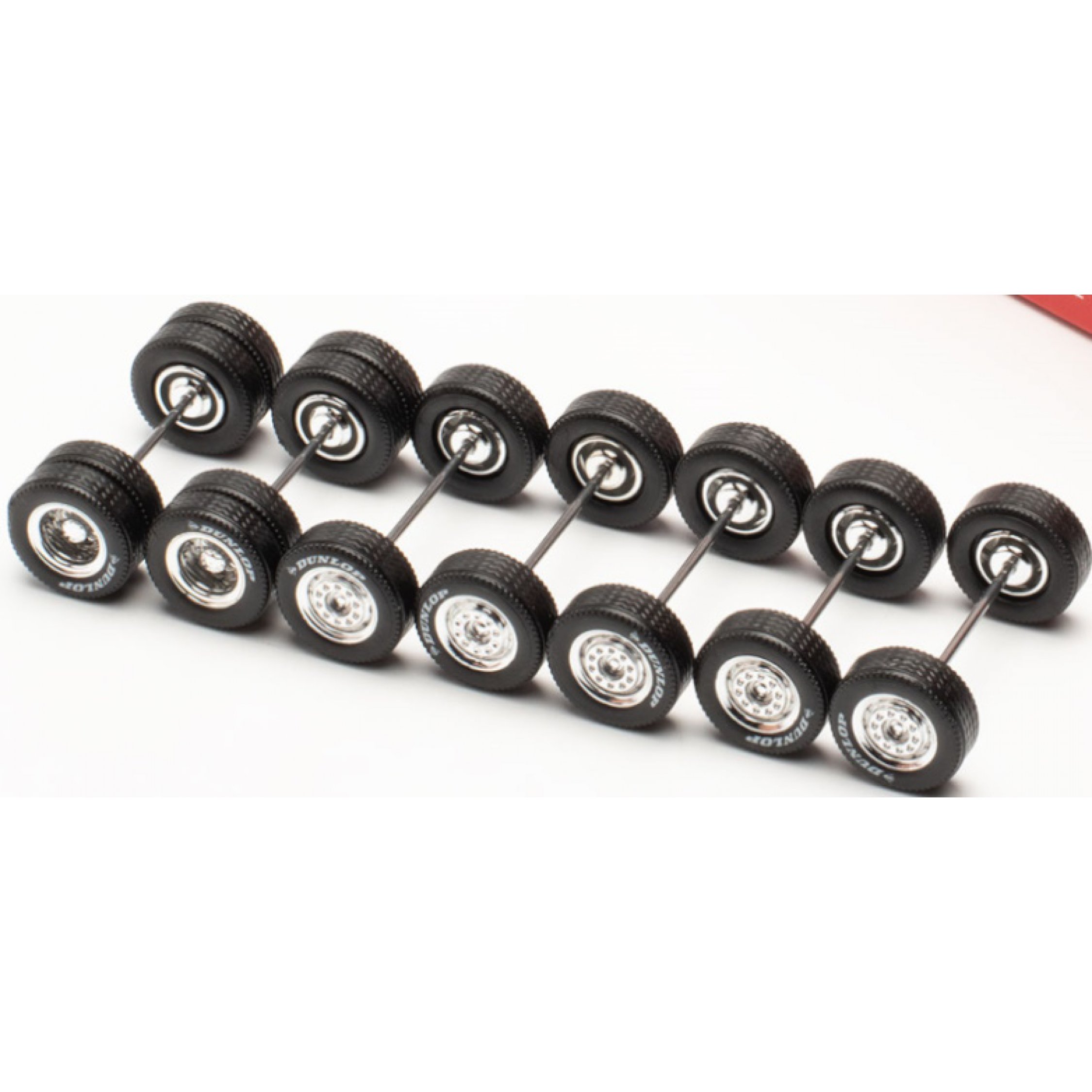 4. Zubehör Radsatz chrom Dunlop, Inhalt: 1-mal Lenkachse, 1-mal Vor-/Nachlaufachse, 2-mal Zwillingsachse und 3-mal Aufliegerachse