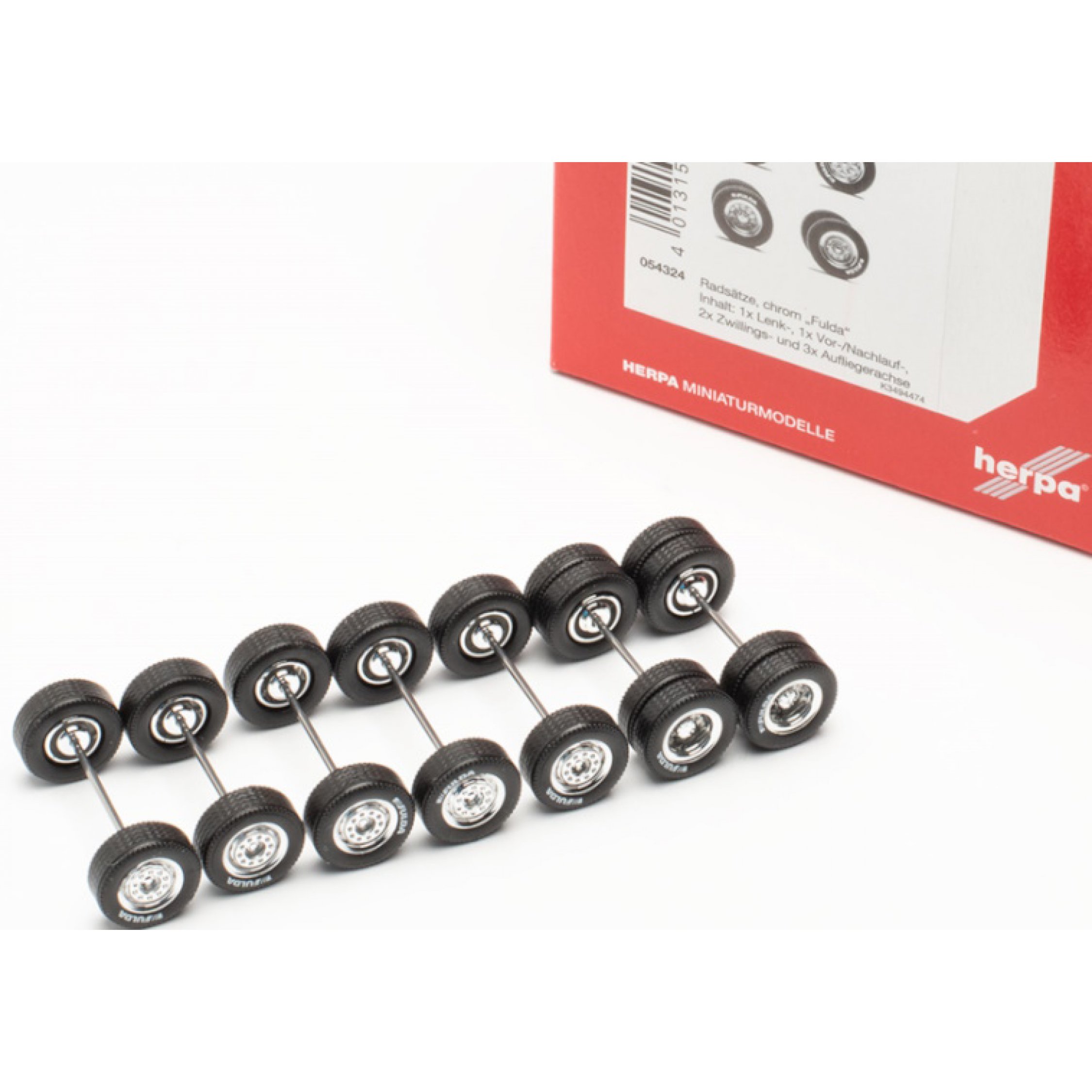 4. Zubehör Radsatz chrom FULDA, Inhalt: 1-mal Lenkachse, 1-mal Vor-/Nachlaufachse, 2-mal Zwillingsachse und 3-mal Aufliegerachse